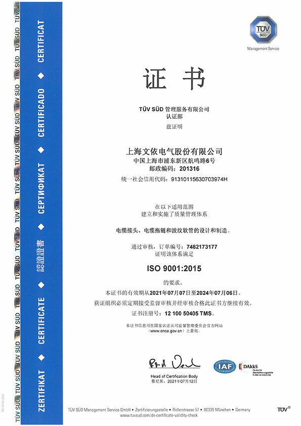上海文依電氣股份有限公司成立于1999年,注冊資金5576.945萬元,是一家專業從事電氣連接與保護相關產品的研發、生產和銷售的高新技術企業,主要產品有電纜防水接頭、軟管及軟管接頭、拖鏈、連接器等,產品廣泛應用于軌道交通、汽車制造、電氣機械、航天航空、軍工裝備等領域,產品遠銷歐洲、亞洲、南美、北美和大洋洲等地區。