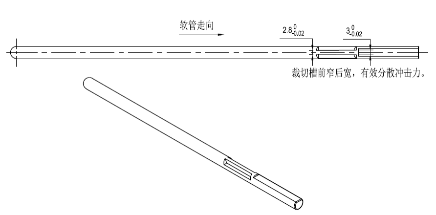 軟管擠出成型后,根據不同材料依次進行水處理等工藝后,進入剖開步驟。為了保證產品開口整齊、所以要求必須是在產品熱溫下進行剖口。規定剖開工裝與擠出設備之間的距離需保證在1-1.5米之間。如果不是在線開口、而是從倉庫內取出已生產完,未剖開的產品,則開口前必須進行80-90度開水煮3-5分鐘;并且剖開工序需在泡水后10-20分鐘內完成。開口前對開口的刀片進行檢查、看是否有損壞、缺口、不夠鋒利等,如有,則開口前必須進行更換刀片后再進行剖開作業。軟管進入剖開工裝,依靠的動力是是雙皮帶輪帶動軟管前進,前進速度為50厘米/秒,經驗證,此速度下軟管所受沖擊力最小。設定后固定速度帶動軟管套入工裝的導向軸上,在軟管靠近破口刀時,會產生巨大推力。同時,雙刀的間隙為3毫米會造成軟管剛接觸刀片時卡住的情況。設計時,將導向軸上設置前窄后寬的兩條槽,即兩條裁切槽,裁切槽前后尺寸相差0.2毫米,如圖3。將兩把破口刀靠在槽上,使雙刀的放置形成前窄后寬的形式,使得軟管與雙刀接觸時受較小的沖擊力,后隨著兩槽間隙的逐漸增大而逐漸增大,有效分散沖擊力,不易產生卡住的情況。